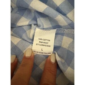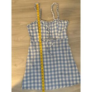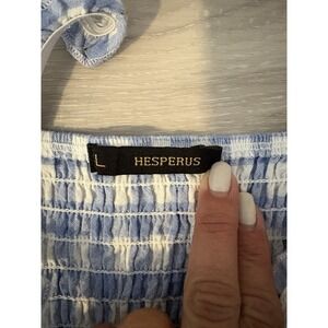 The Hesperus Dress Girl Gingham Pattern Ruffle Top Sleeveless Mini Dress in size L features a sweet-heart neckline and off the shoulder sleeves, perfect for a wedding or casual occasion. Made from 100% cotton fabric with a lace texture and accented with ruffles, this dress exudes a cute and playful style. The blue gingham pattern adds a touch of charm to this mini dress, making it a lovely choice for summer and spring seasons. Perfect for a baby shower or any plaid-themed event, this dress is sure to make a statement.