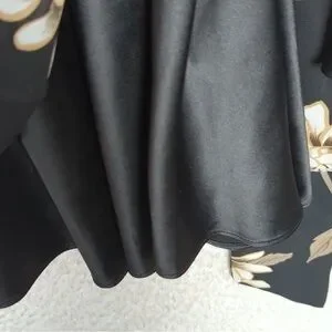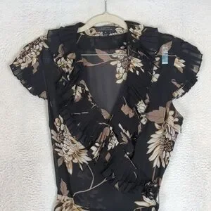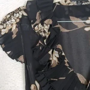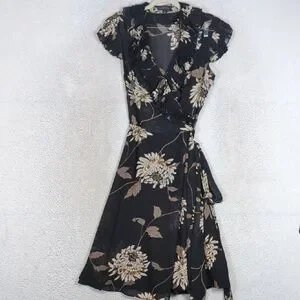 Stylish midi dress with floral pattern. Features a wrap design and ruffled sleeves. Semi sheer with an attached, full-camisole slip lining.