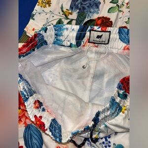 Vibrant floral button-up shirt with matching shorts/ shorts are close to swim bottoms