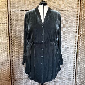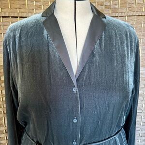 GORGEOUS—photos don’t do it justice. Tunic or mini dress, it’s up to you! “Shale” (charcoal) silk blend velvet with satin collar, lapels, and waist tie. Button front, long sleeves w/ dramatic cuffs. New, never worn. Size XL, TTS. Pic #1 is a stock photo.