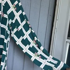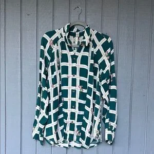 Stylish button-down shirt by Free People. Features a green and white checkered pattern with floral accents. Perfect for casual wear.