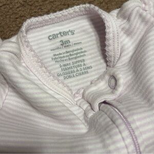Cute carters sleeper/footie/pajamas, size 3 months. Lavender and white stripes with a bunny in a hot air balloon on the front. Used, but in very nice condition!