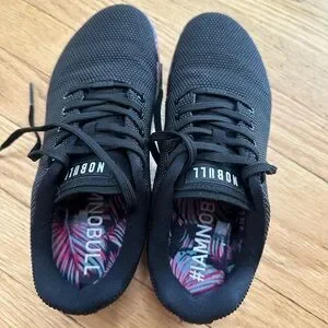 Size 8.5 NOBULL Women’s Outwork shoes in black with multicolored sole. Great lifting shoes. Only worn 2-3 times, so they are practically new in great condition. Comes with laces that match the sole
