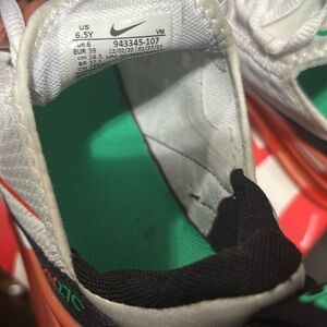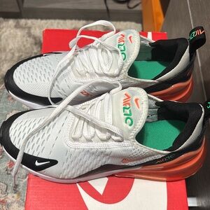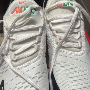 Comfortable Nike 270 sneakers with a black and white design. They do run narrow so I had to go up 1/2 size. No smells, minor signs or wear! There is slight rubbing from my jeans as shown in photo. Well taken care of and in great condition!!