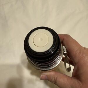 Eco-friendly bamboo thermos with a sleek silver lid. Features a convenient strap for easy carrying.small dent on the lid, still fully functional