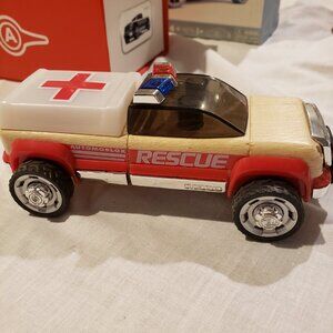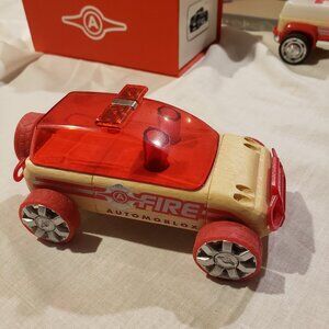 AutomoBlox Mini Cars Lot of 5, wooden cars, Coupe in box 4', truck in box 5", Fire SUV (no box) 4.5", Rescue Wagon (no box) 5.5", Police Car (no box) 4"
