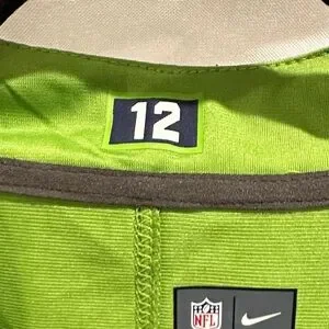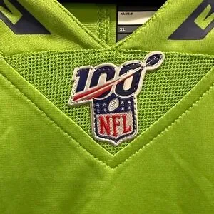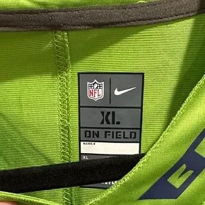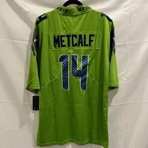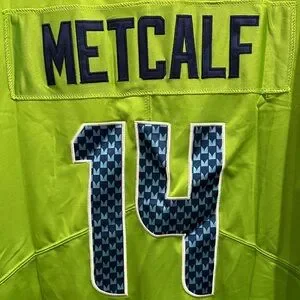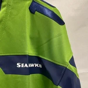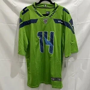Vibrant green jersey with navy details. Seahawks logo and number 14. Ideal for supporters.