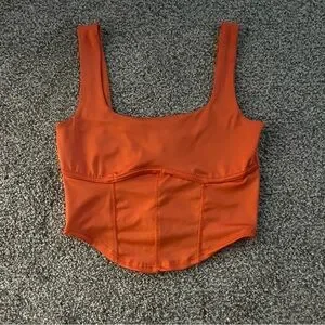 Stylish vibrant orange cropped going out top with a square neckline, curved hem, and corset style design.