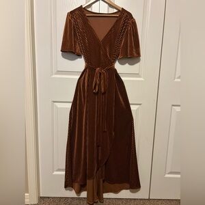 Elevate your wardrobe with this chic rust brown wrap dress. The high-low design adds a modern touch, perfect for any occasion. Women's Velvet V Neck Wrap Semi Formal Dress Cocktail Party Maxi Dress For #Wedding Guest