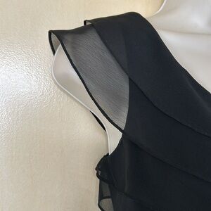 Adrianna Papell black flowy cocktail dress. Layers of ruffles around the neck and skirt with a pleated band at the waist. The silhouette is so flattering! Perfect for date night! Like new condition.