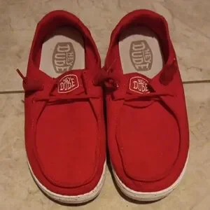 Bright red, hey dudes. Easy slip-on design. Lightweight and comfy.