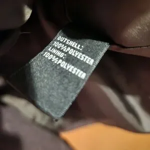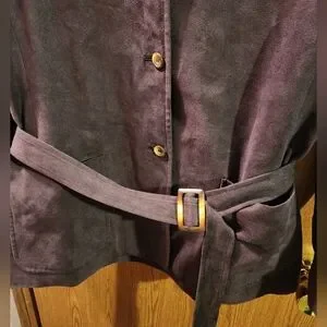 In good shape! Nice brown color! This jacket comes with a belt, and has loops you put the belt through to wrap around you. You could wear the jacket without the belt though. The jacket buttons up. The pit to pit measurement is 20.5" and the length is 27".