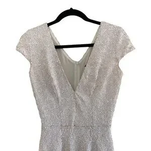 Matte sequins stun over short cap sleeves, and a darted bodice with V-neck and back.