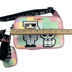 Features: Karl Lagerfeld (figure) applique, Choupette (cat) applique, Signature Karl Lagerfeld Paris nylon guitar style crossbody strap, Camera bag style, Dual zippered compartments