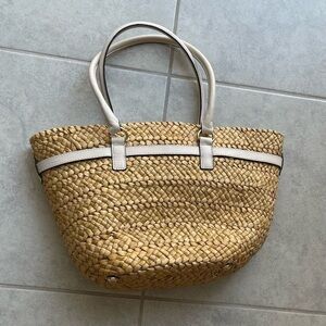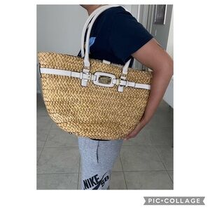 Michael Kors Straw Bag. Straw bag has cream leather trim & handles. Snaps for closure. Four prongs @ bottom. 18.5 by 11 inches. Excellent condition