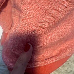 VS Pink pullover size is Large. Color is orangish with love pink spelled out on front. The writing has cracking and there is a small hole on the front as shown in the pics. Being sold as is.