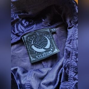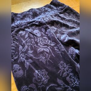 Step out in style with these elegant Killstar 'Bite Me' velvet leggings featuring a chic lace-up design and inlaid skull and flower pattern.