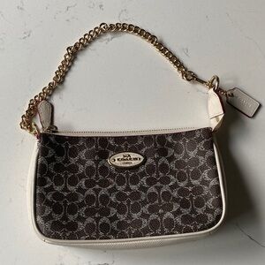 Chic Coach wristlet with signature pattern. Features brown and cream tones. Ideal for versatile styling.