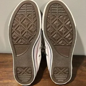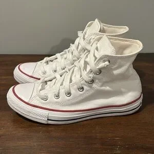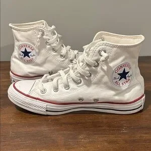White canvas high-tops with classic Converse logo. Red and blue accents on the sole. Iconic lace-up style.
