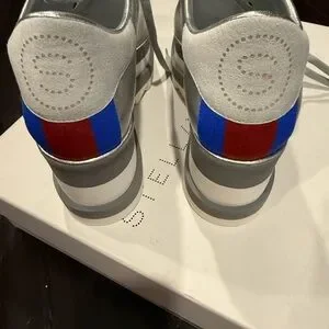 These size 37 Stella McCartney Elyse style platform sneakers are a faux leather silver metallic with ridged sole and red and blue striping as shown . Worn a time or two .. EUC !! Comes with box .