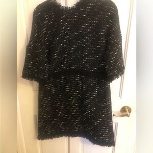 New with tags. Zara black tweed dress. There is short fringe on the waist, hem, sleeve cuff, and neckline. The back has a small keyhole on the back of the dress. The dress is predominately black but it has white and gray threads going thru the fabric. The fabric content is 100% Polyester. The tweed texture give the dress an interesting feel and look.