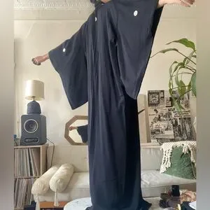 Vintage Japanese Black Silk Kimono Tomesode Family Crest Thin - Height 58.66inch