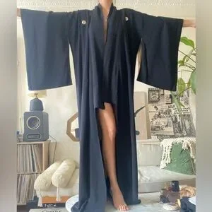 silk kimono, tomesode, traditional attire, family crest, vintage Japanese, black kimono, formal wear, antique textile, ceremonial clothing, heritage fashion