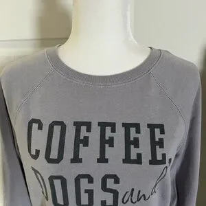 Excellent used condition light gray lightweight sweatshirt with Coffee Dogs and Sweatpants graphic. Size extra small. Can fit extra small and small. Shown on size 6 in last pic. Mannequin is a size 4. I’ve only worn once or twice. In perfect condition. The bottom hem is the type where it is just cut not sewn. That is the style and not a flaw. I quit drinking coffee and stopped wearing it. Please feel free to ask any questions at all. I am 5 star seller and Posh ambassador. Thanks