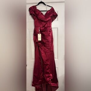 Step out in style with this elegant off-shoulder burgundy dress. Perfect for any special occasion, this dress combines sophistication with a modern twist. The rich burgundy color adds a touch of luxury to your wardrobe.