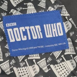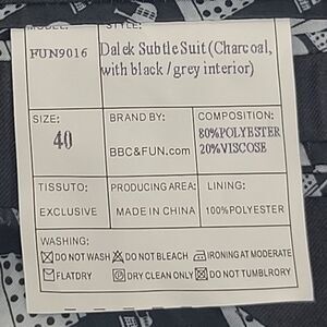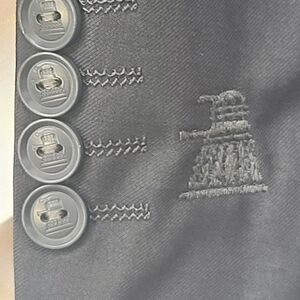 EXTERMINATE! Be a double agent for Gallifrey with this sleek charcoal grey sports coat from BBCs Doctor Who. Look at the Dalek stamped buttons, Dalek embroidery on the sleeve cuff, and the Dalek lining. Sure to make Davros proud!