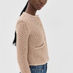 Chic beige cardigan with textured knit in excellent condition. Features button closure and front pockets. Ideal for layering. 100% merino wool. Dry clean only.