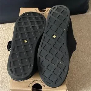 Canvas black shoes with adjustable strap in front. Back if shoe is a bit stretched from walking in them but otherwise in good shape
