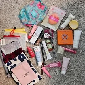 Vibrant Kate Spade floral pouch filled with beauty essentials. Includes creams, lip balms, and more. Ideal for travel or daily use.