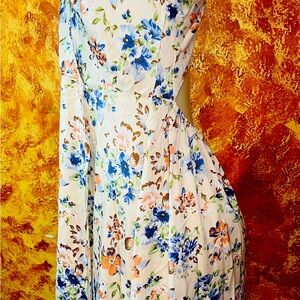 Chic dress with floral design. Features blue and orange flowers. Lightweight and stylish.