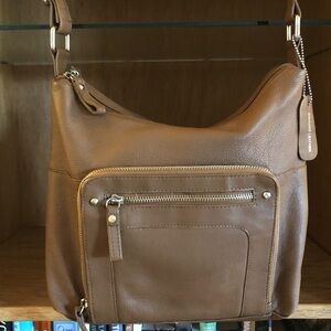 This EUC Great American Leather Works crossbody organizer bag has a two zipper compartments interior, a side snap closure organizer, and an exterior snap pocket. In the organizer pocket is four credit card, one cash, and one zipper pockets. The strap is adjustable and the interiors have a pocket. The bag has a 100% cowhide leather exterior. Dimensions- 10” X 9.5” X 3.5”. The strap is approximately 46”.