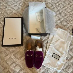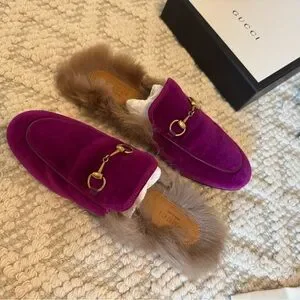Gucci velvet magenta mules with plush fur lining. Elegant gold-tone horsebit hardware. Gently worn, in amazing condition/ comes with original box and shoe dust bags! Size 38