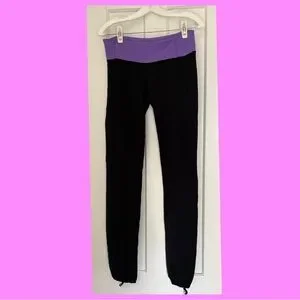 Stylish vintage black Lululemon leggings with a purple waistband. Perfect for workouts or casual wear. These do not have a size tag but fit like a tall 8, and come in good pre-loved condition. Please see photos.