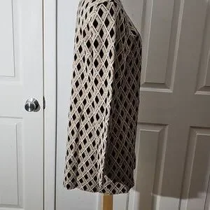 This lovely sweater is in very good condition and quality. 47% cotton 39% modal 6 % polyester 5% metallic 3% nylon. size large. pit to pit flat measurements are 23". The sleeves are 19". the top to bottom length is about 31". Great with black trousers or skirt for any occasion. Consider making a bundle and get an even better offer and save on shipping.
