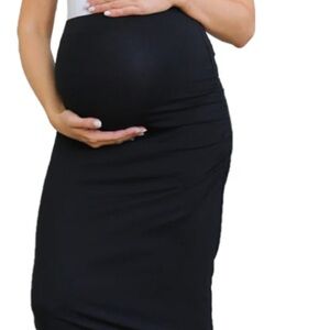 Chic black midi dress for expecting mothers. Comfortable and stylish design.