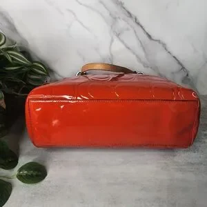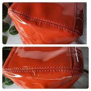 Patent leather accepts color transfer easily. This bag is in very good condition with few signs of wear other than some surface scuffs and small transfers as noted. I am out of Saphir Vèrnis cleaner, but it may help minimize the imperfections. The bag is in bright, very good, pre-loved condition. There are no stains or odors in the interior.
