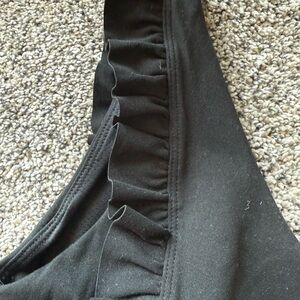 Chic black activewear top with ruffle accents. Ideal for fitness or leisure.
