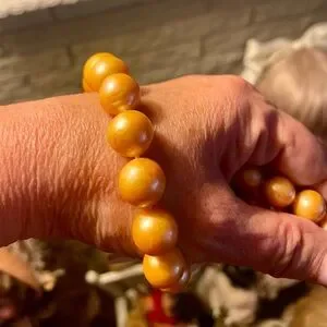 This is a beautiful authentic golden south sea pearl necklace. 17 1/2 inch’s. Each pearl is 10-14 mm in size. They are knotted in between with fine double silk string for security and durability. They have natural growth textures. They are beautiful with a good shine. Please look at all pictures. This is the exact item you will get if you purchase this item. This beautiful statement necklace is heirloom quality.