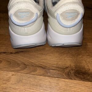 Reebok sneakers with a sleek design. White and tan color scheme. Ideal for everyday style.