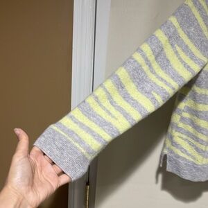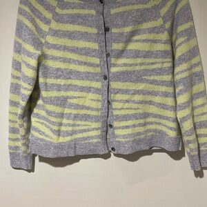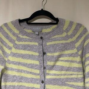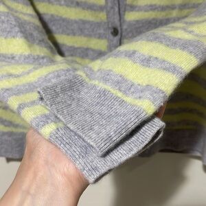 Stylish cardigan with gray and yellow stripes. Button-up front. Soft and comfortable fabric.