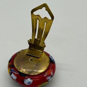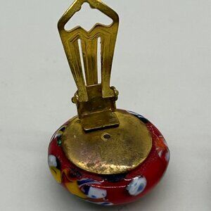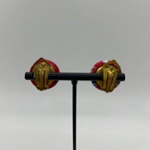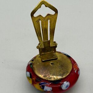 These vintage clip-on earrings showcase exquisite Venetian glass in rich red hues with multicolored accents. Gold tone backs lend timeless elegance to this classic design.