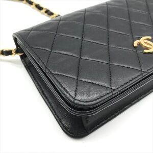 Authentic vintage black flap Chanel bag with the iconic CC gold hardware detail. There is a hallmark on the CC showing us that the gold hardware is plated in 24k gold. Chanel stopped plating with real gold in late 2008. There are some lovely Chanel branding details on this bag, under the flap the CC is stitched. this model was made between 1986-1988.