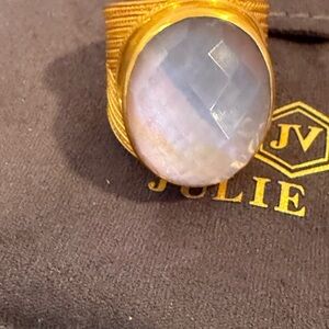 This retired Julie Vos Verona ring is NWT size 7 according to measurement is a lavender faceted imported glass stone and set in 24k plated gold . It has a textured trim as shown and can be made a bit larger/ smaller due to band .. see photos . A statement ring . Hard to catch the true color in photos .. but lavender .
