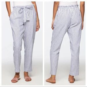 Pink seersucker pinstripe pants with paper bag waist and tie. Small slits on bottoms.