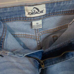 These Jordache denim shorts are new without tags in a size 12. No rips or tears were noted in the shorts. Designed for comfort with a looser fit through the thighs and a mid-rise waist. These shorts have the 5-pocket design. Measure about 17 inches hip to hip with an inseam of about 4 inches.