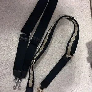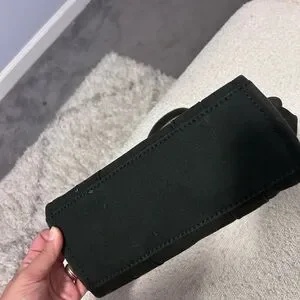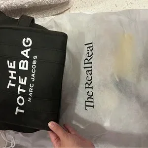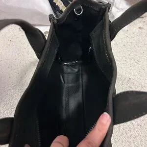 Compact black tote by Marc Jacobs. Ideal for daily essentials. There is slight discoloration on edges where the black looks more brown. The bag was bought used so it is an older bag. The straps are practically new. Bought both separate from the bag. And both were 95$.